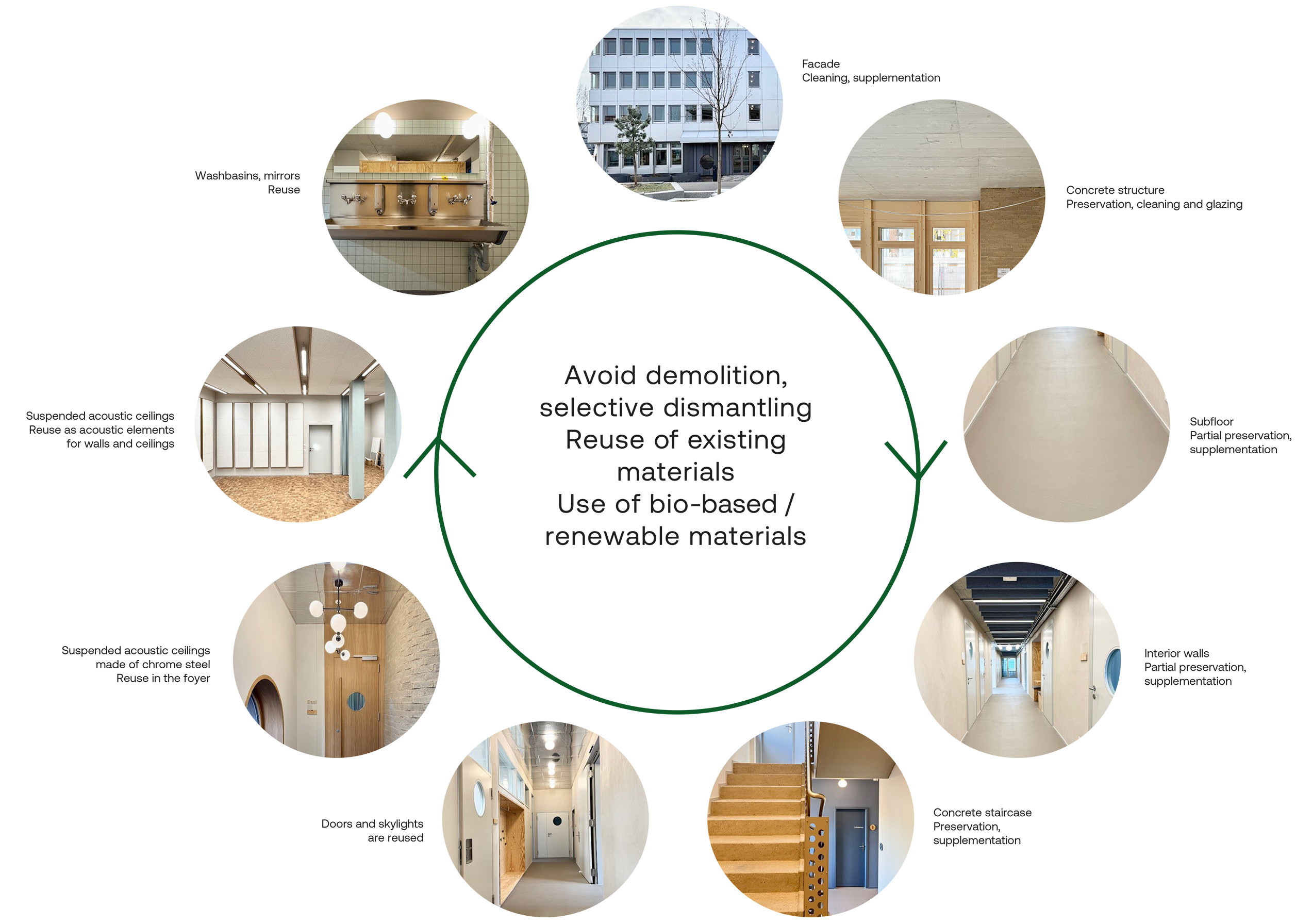 Instead of demolishing the office building, we are focusing on sustainable construction in existing buildings. Our concept is based on the greatest possible use of natural, renewable, and reusable materials.