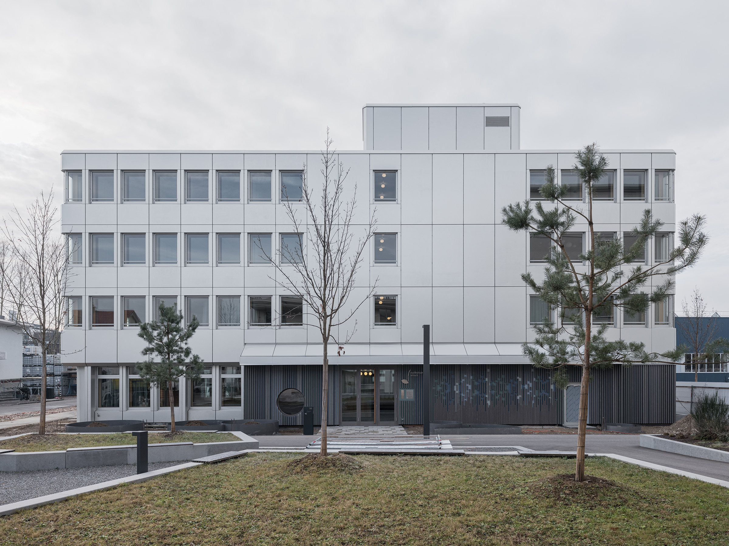 The most outwardly visible sign of the remodeling is the relocation of the entrance: Where warehouses were once attached to the office building, the school now has its new address. The rear-ventilated timber façade accentuates this part of the ground floor as a base building. A long bench serves as seating for visitors. The large porthole in the wooden façade affords initial impressions of the interior. One part of the west-facing side façade will be greened, with climbing plants gradually growing up the three floors of the music school from the ground floor.