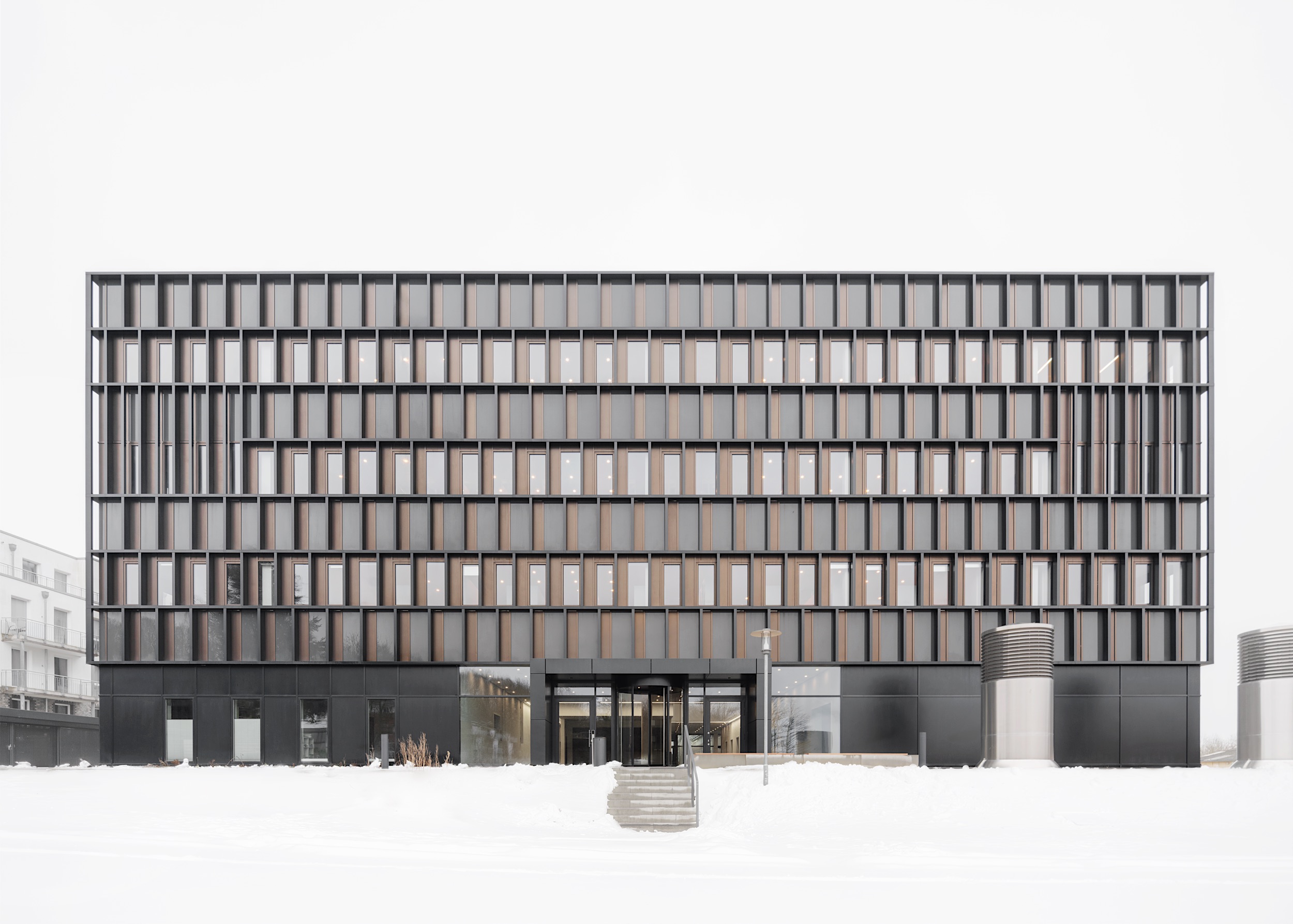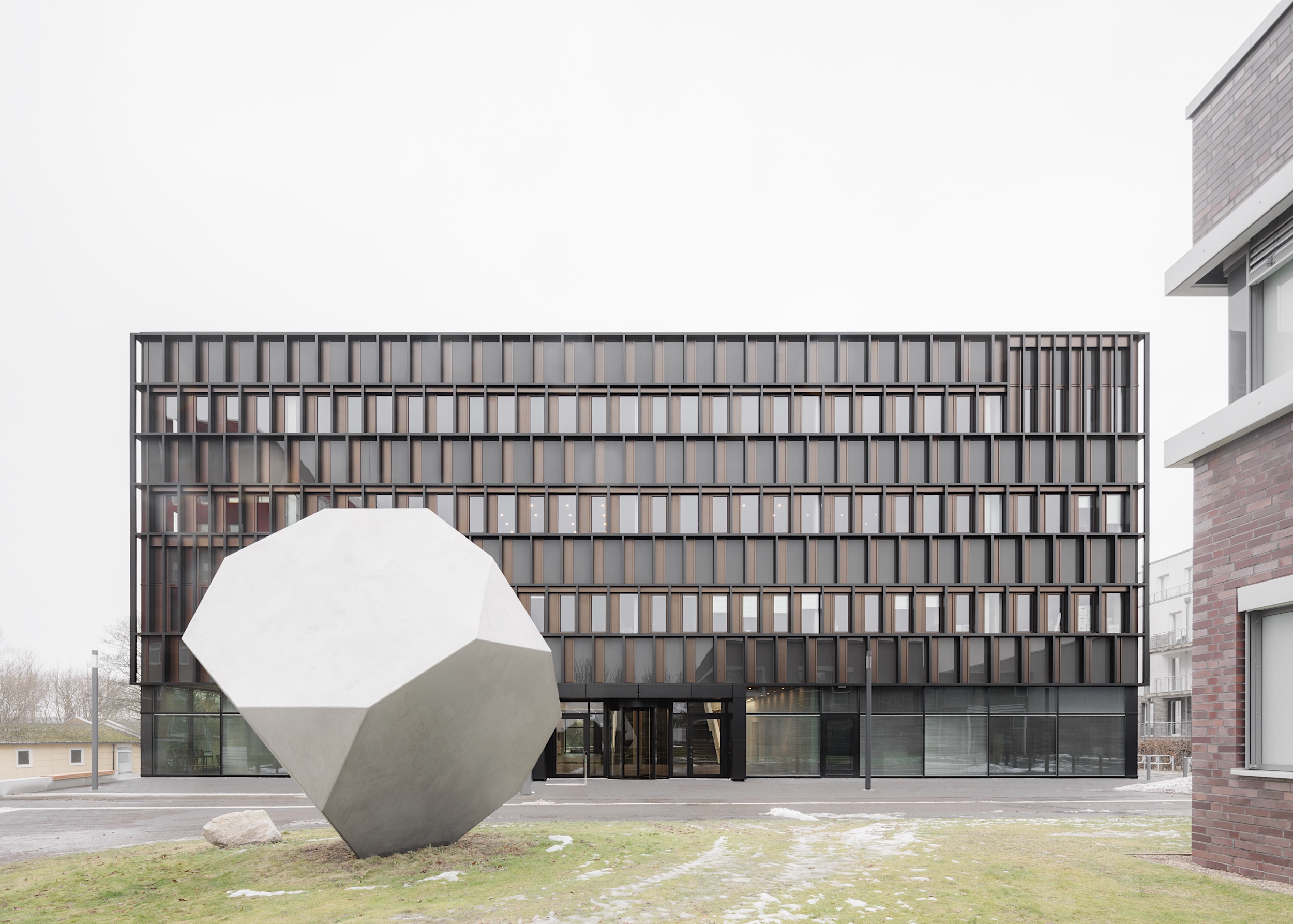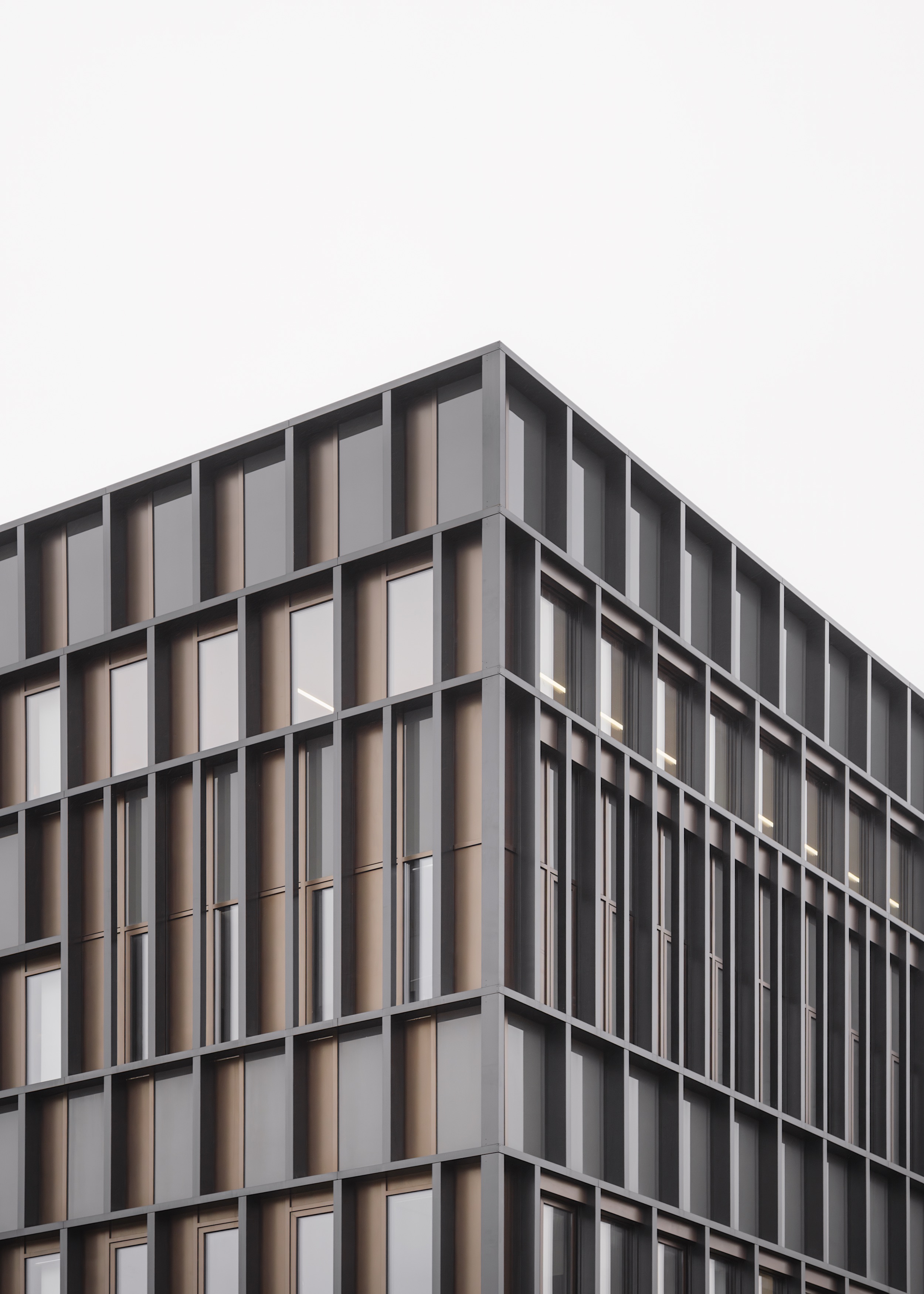 Über dem verglasten Sockel ist das Haus mit einer netzartigen Metallfassade bekleidet. Um den verschiedenen Nutzungen im Innern Rechnung zu tragen, ist sie in offenere und geschlossenere Bereiche gegliedert. Die Pfosten-Riegel-Konstruktion ist mit schmalen Lisenen aus pulverbeschichtetem Aluminium versehen, die der Fassade eine skulpturale Tiefe geben. Der Wechsel aus mattschwarzen und warmgolden schimmernden Flächen rhythmisiert die Fassade. Materialität und Profilierung erinnern an Überseecontainer und stellen so die Verbindung zur industriellen Hafenumgebung her.