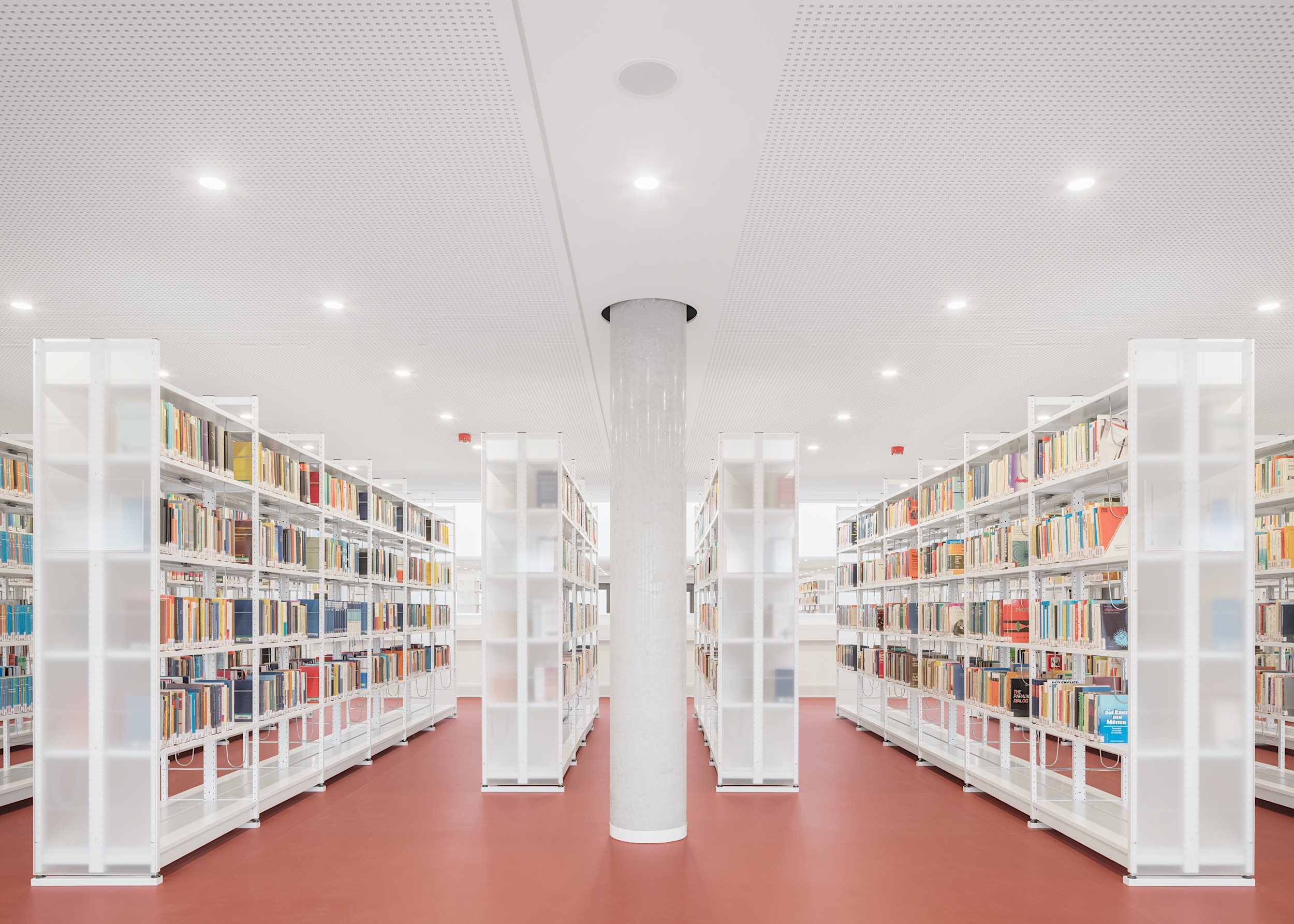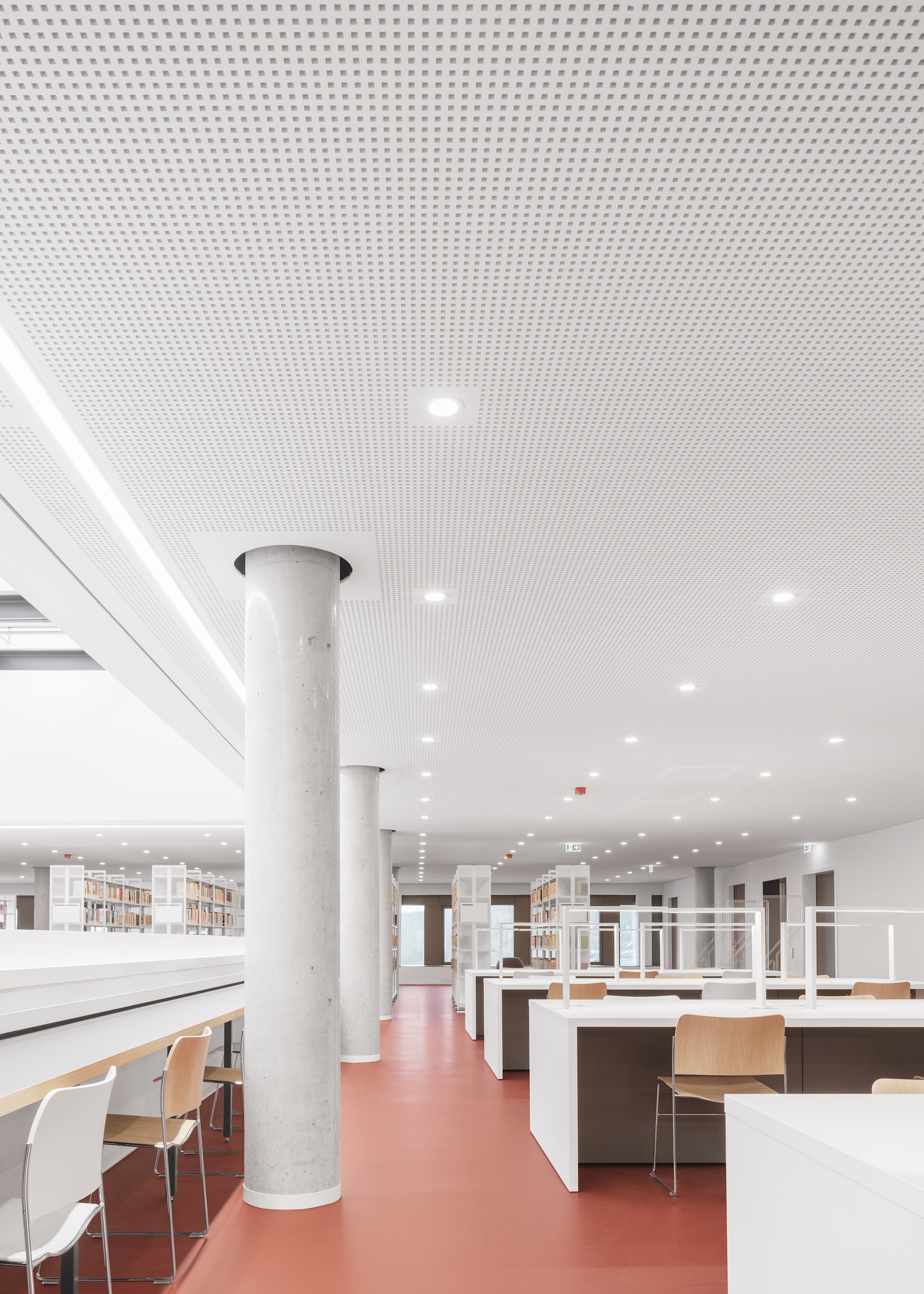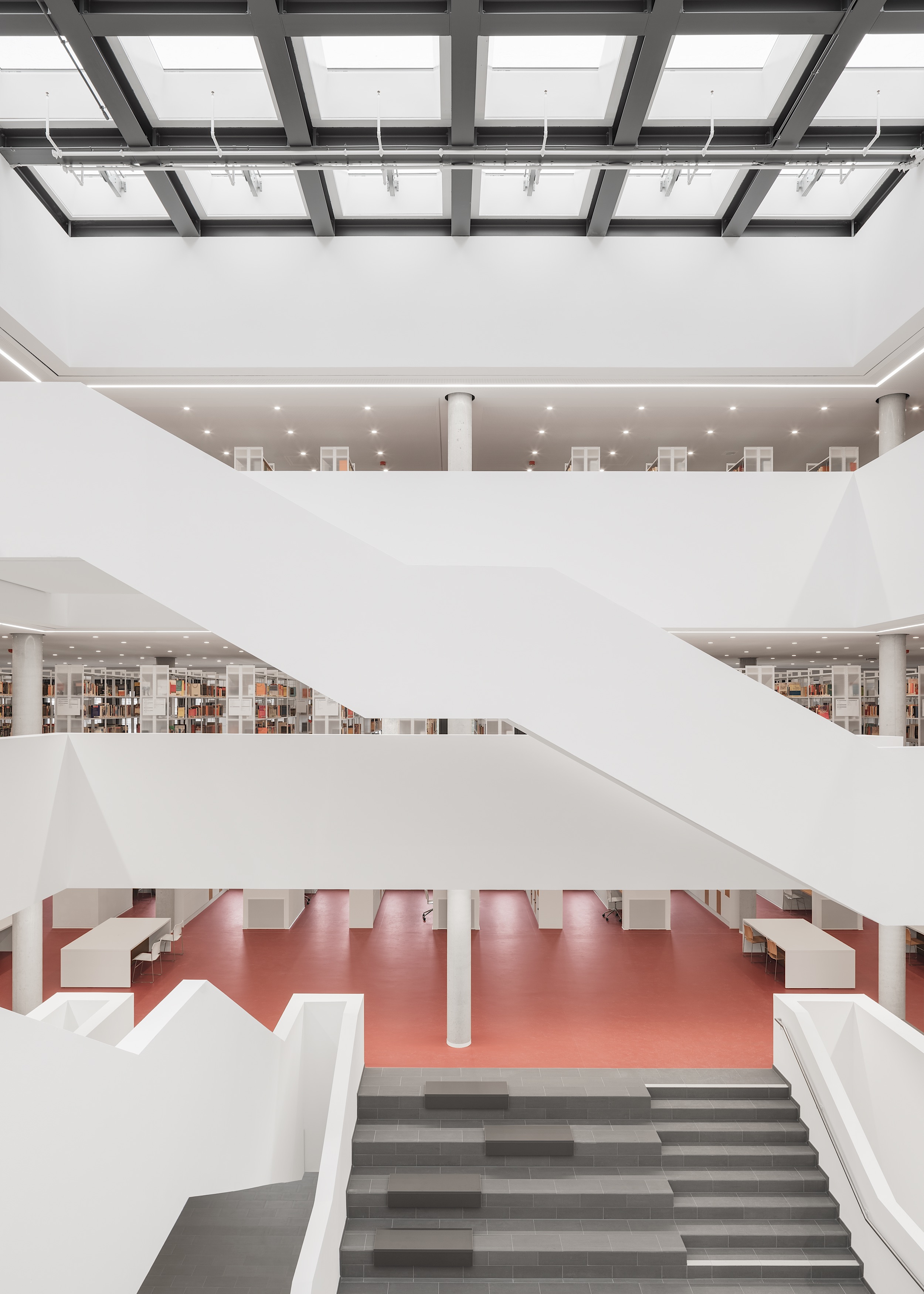Das Haus adressiert fächerübergreifend alle Studierenden, sein Nutzungskonzept macht es zum lebendigen Zentrum der Hochschule. Ein offenes Foyer nimmt Nutzerinnen wie Besucher in Empfang und führt sie zum Herz des Bauwerks: dem lichtdurchfluteten Atrium. Von hier aus führt die skulptural ausgestaltete Haupttreppe nach oben, um alle Ebenen zu verbinden. Mit ihren breiten Sitzstufen ist sie nicht nur Zirkulationsraum, sondern auch ein Ort des Verweilens. Dank zahlreicher Sichtbezüge gibt sie Orientierung im kompakten Baukörper, 36 Oberlichter sorgen zudem für eine gute Lichtstimmung.