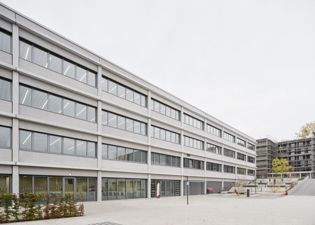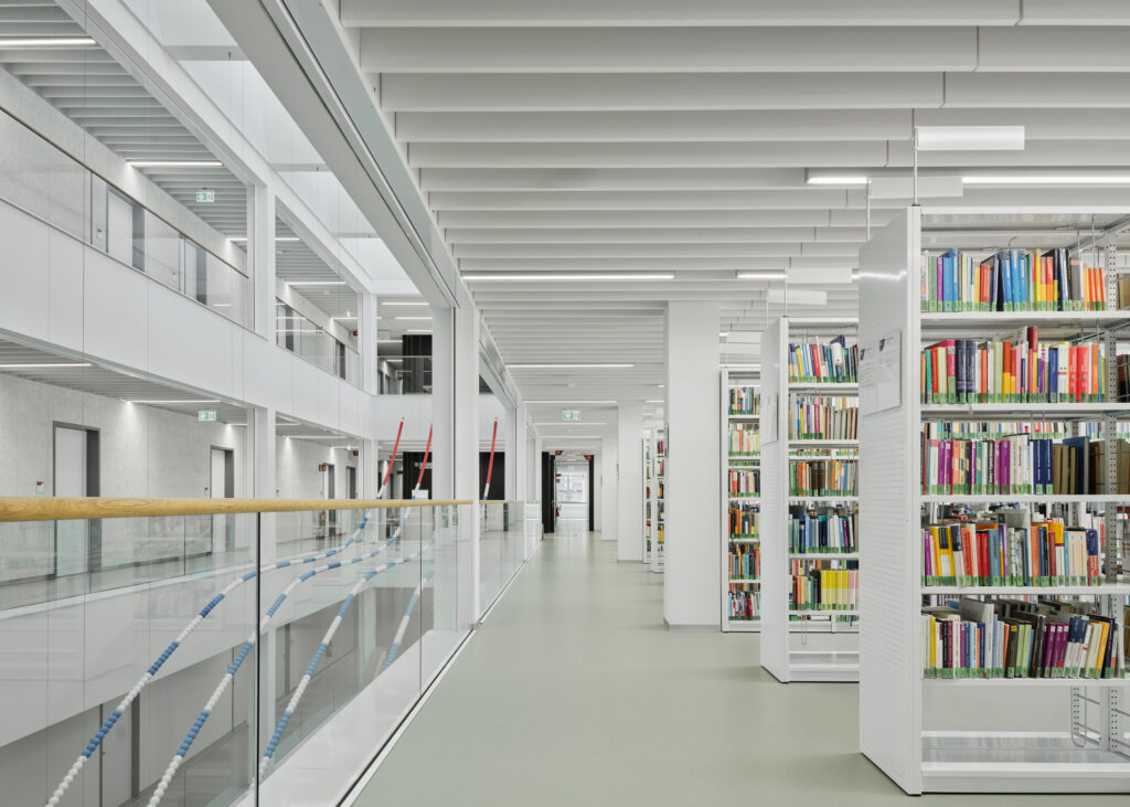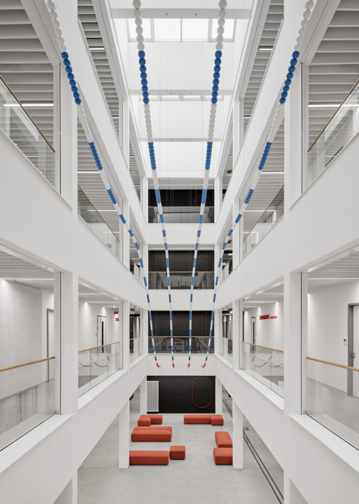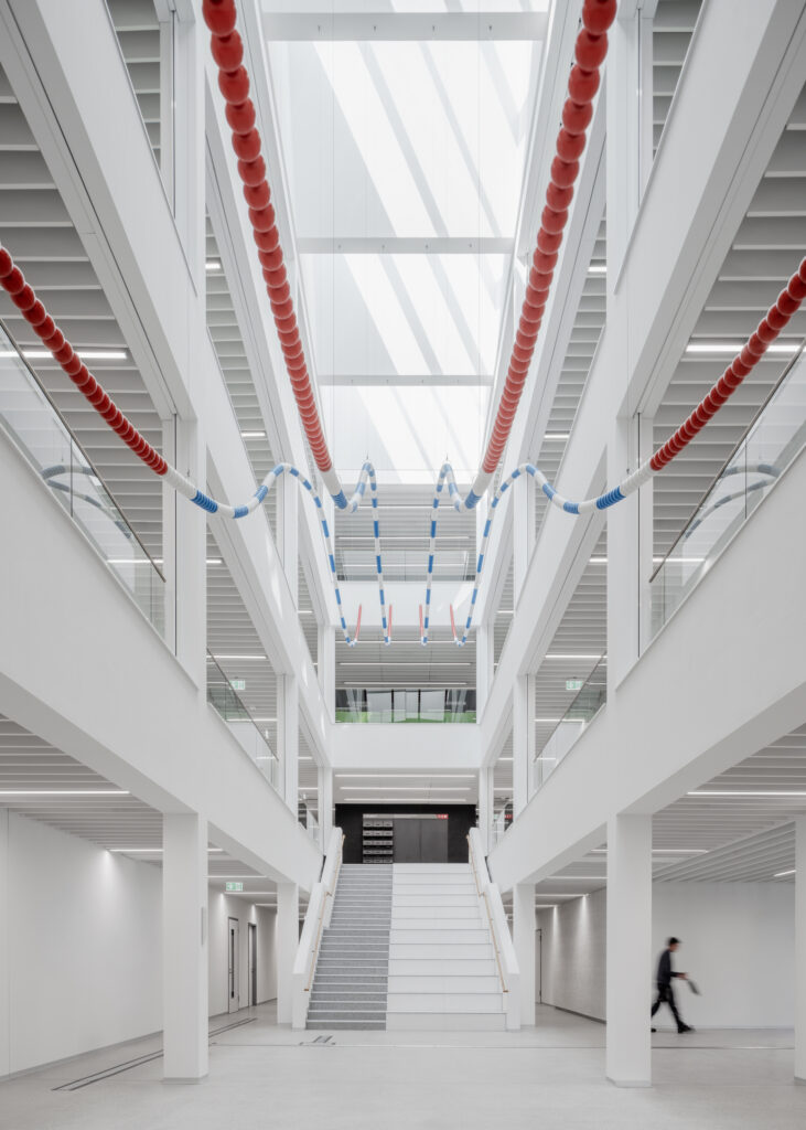 Das Atrium, das Herzstück des Projekts, verbindet diese Bereiche. Rund um das Atrium wechseln sich offene Zonen wie die Cafeteria mit Seminarräumen und dem Vorlesungssaal ab, was «ein lebendiges Zusammenspiel der unterschiedlichen Lern- und Begegnungsbereiche» schafft, so der federführende Architekt Carsten Krafft. Dieser helle, grosser Erschliessungs- und Aufenthaltsbereich lädt zu informellen Begegnungen ein und auch hier ist es eine Treppe, die Freitreppe zwischen dem ersten und zweiten Geschoss, die zum Austausch und Verweilen anregt. Zwei Treppenhäuser befinden sich zudem in der Kernzone, sie dienen mit Aufzügen auch dem Gebot der barrierefreien Erschliessung.