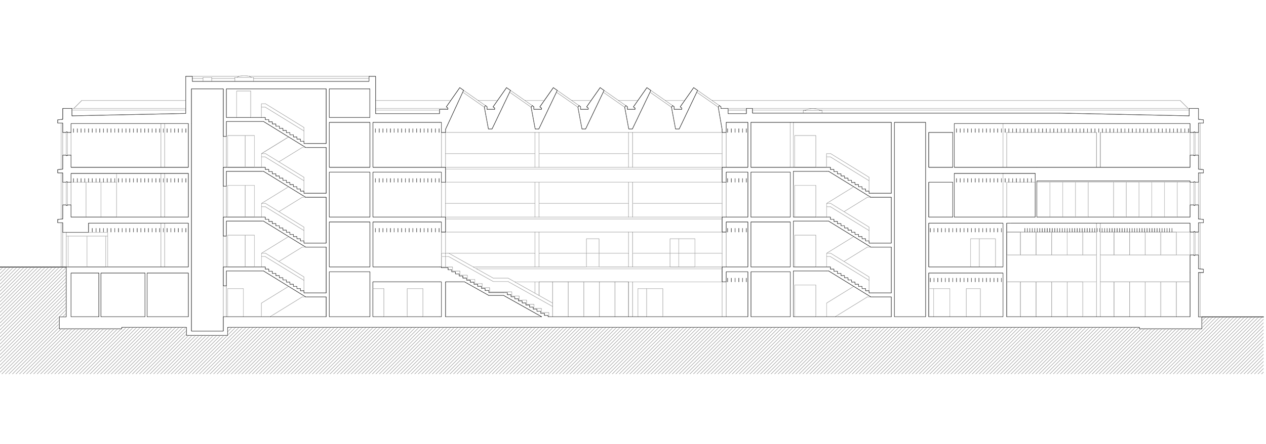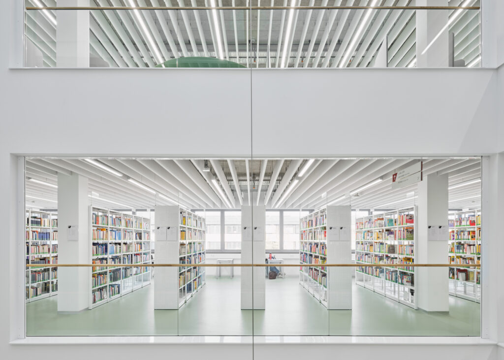 Vertikal und horizontal gliedert sich der Neubau in drei Bereiche: Im westlichen, stirnseitigen Gebäudeteil befinden sich Haupteingang und Cafeteria. Mit ihrer durch den Hang bedingten Lage im ersten Obergeschoss öffnen sie sich zum neugeplanten Vorplatz des Campus‘. Ostseitig liegen die Arbeits- und Lernzonen. Sie erstrecken sich nicht nur über alle Geschosse, sondern schliessen auch im Erdgeschoss an den Lernhof an. Auf das erste und zweite Obergeschoss verteilen sich die Bibliotheks- und ausgewiesenen Leseflächen.