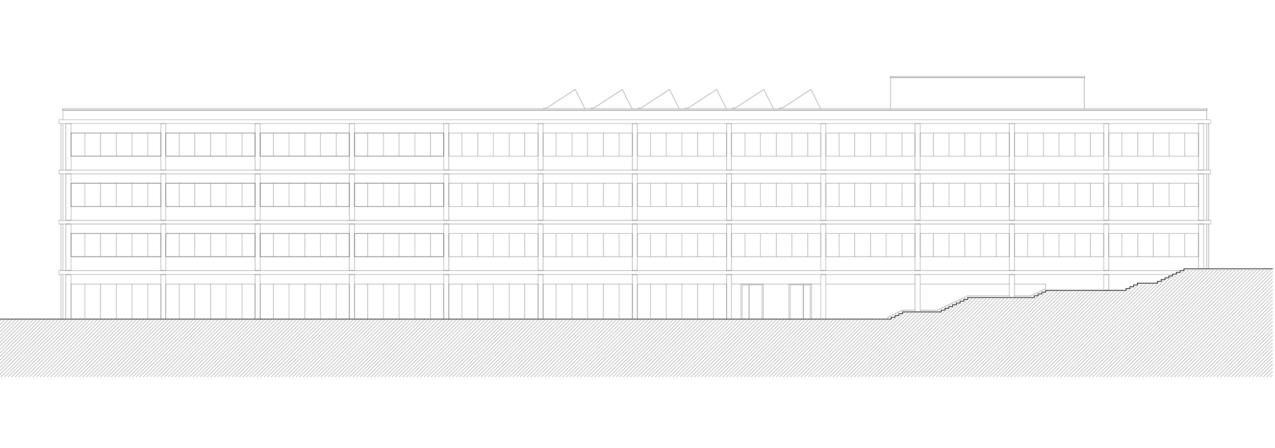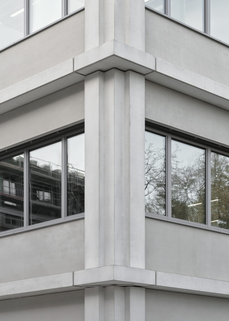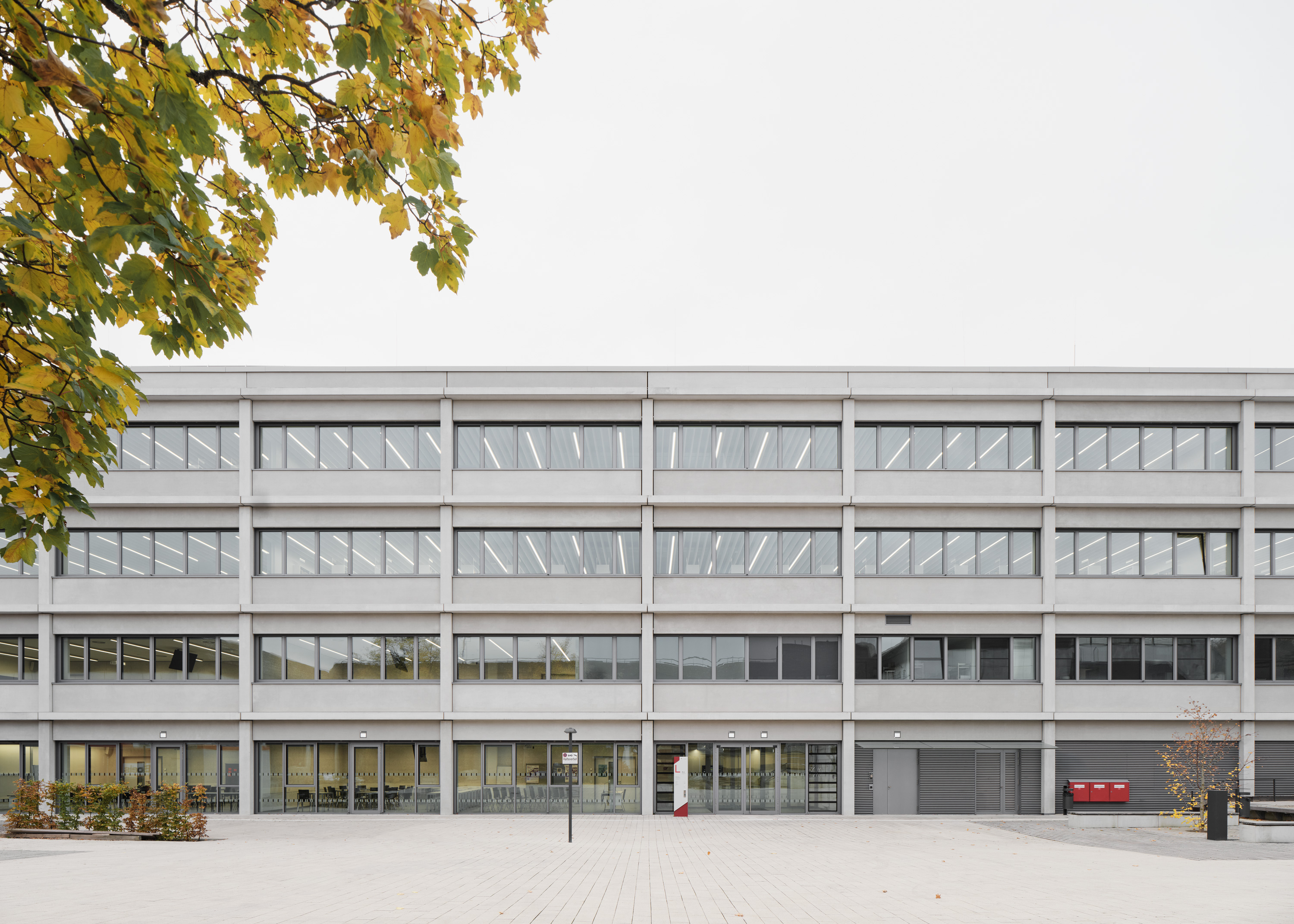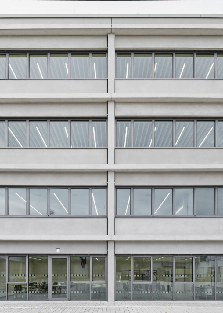 Die Betonfassade betont den prägnanten Charakter des Lehr- und Lernzentrums als «Arbeitshaus». Ihre Konstruktion bleibt aussen wie innen ablesbar: Die horizontalen und vertikalen Elemente des Stahlbetonskelettbaus sind den Betonfertigteilen mit zurückversetzten Sturz- und Brüstungsbereiche markant vorgelagert. So entsteht ein stringentes Relief. Fensterbänder unterstreichen die Horizontalität des langgestreckten Baukörpers.